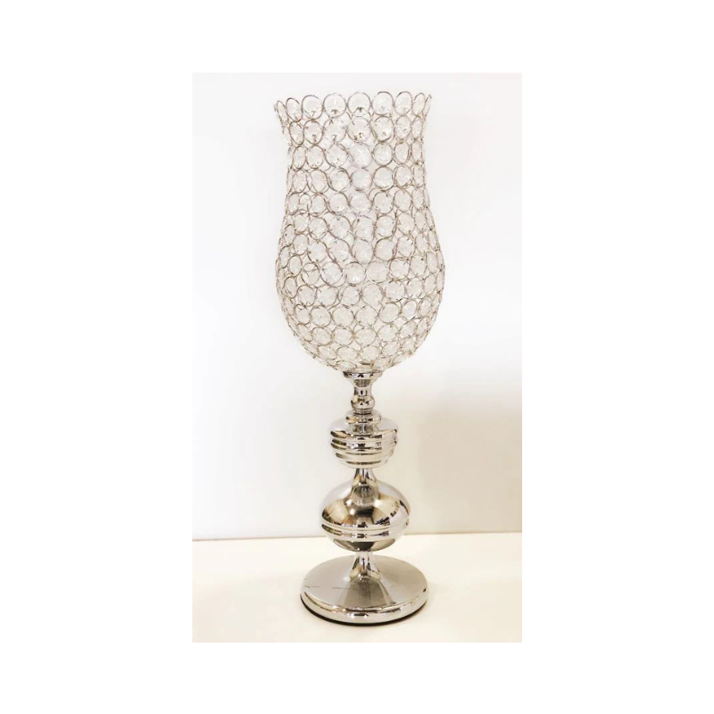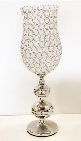 Big silver hurricanes(24''h * 8''d) are shiny sparkling pillars with a beautiful charm. These have crystals embedded in an hourglass shape metal cage which can add a graceful outlook and be used to enhance the ambience. These hurricanes will be the perfect decor pieces for any kind of occassion/party/weddings. These pieces are suggested to be handled with care and extra caution.