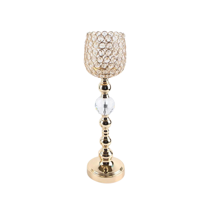 Hurricanes (24''h * 8''d) are shiny, sparkling pillars with a beautiful charm. These have crystals embedded in an hourglass-shaped metal cage, which can add a graceful outlook and be used to enhance the ambience. These hurricanes will be the perfect decor pieces for any kind of occasion, party, or wedding. These pieces are suggested to be handled with care and extra caution.